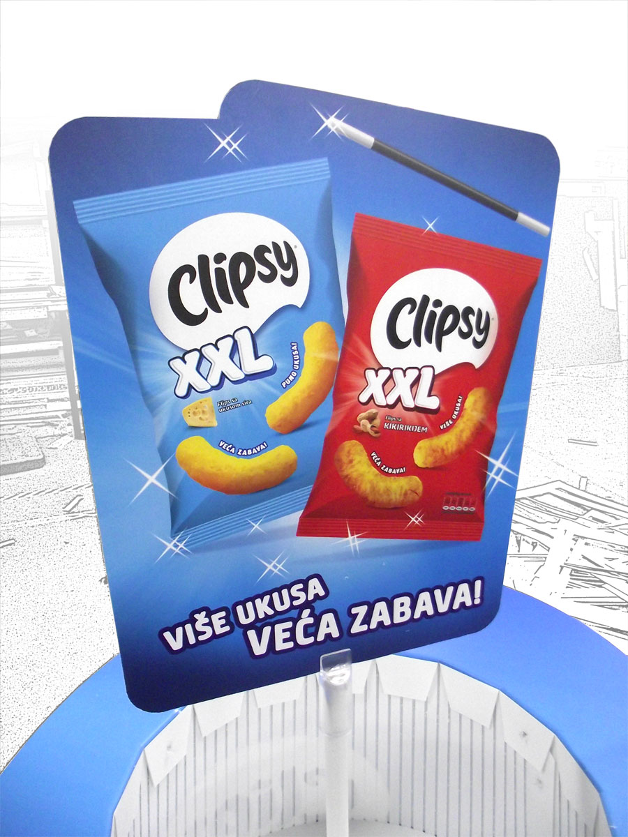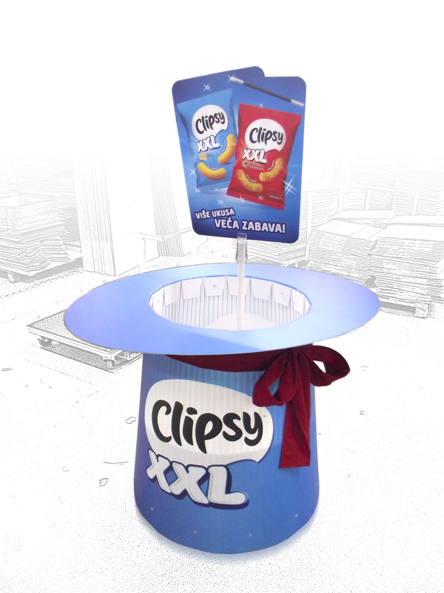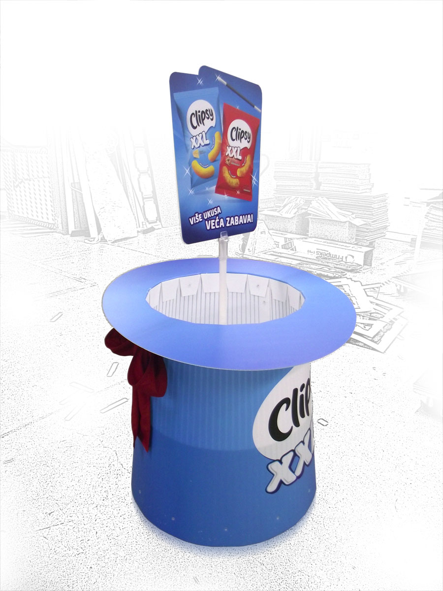 La richiesta del cliente era realizzare l’espositore la cui base doveva arrivare ad una altezza predefinita in modo che potesse contenere prodotti leggeri e avesse l'aspetto di un cappello a cilindro con stampa bilaterale e un grande nastro con fiocco avvolto attorno al cappello.